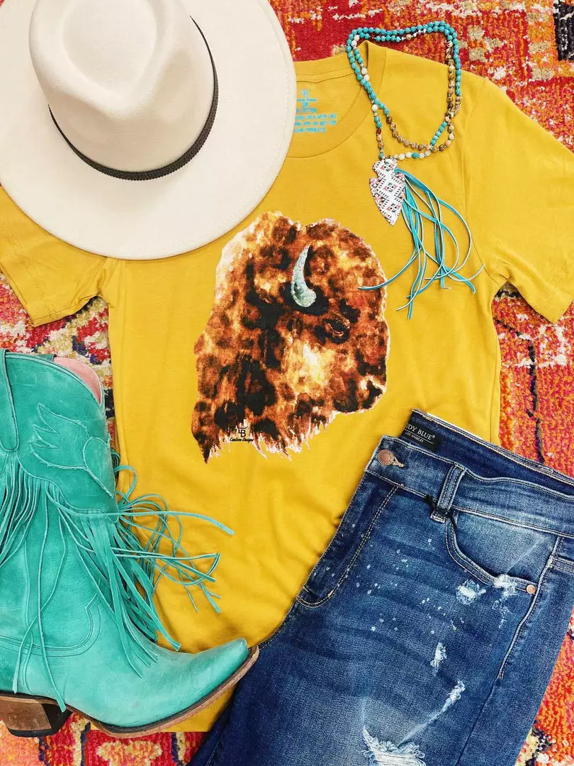 Yes, please! Our “Where The Buffalo Roam” Tee is a guaranteed must-have! This mustard tee features a buffalo head with a leopard print. The mustard-colored tee makes this leopard pop! Not to mention, the bling gives it a little extra sparkle! Bling is included with the tee! This graphic tee pairs perfectly with all of your turquoise jewelry! Unisex fit.