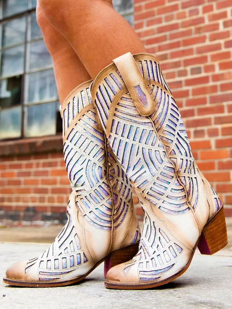 Southern Fried Boot Co. has done it again! Our “Retro Cowgirl” Boots fit a 13″-16″ calf beautifully. These boots feature a custom laser-cut design with iridescent pink hued sequins.Â