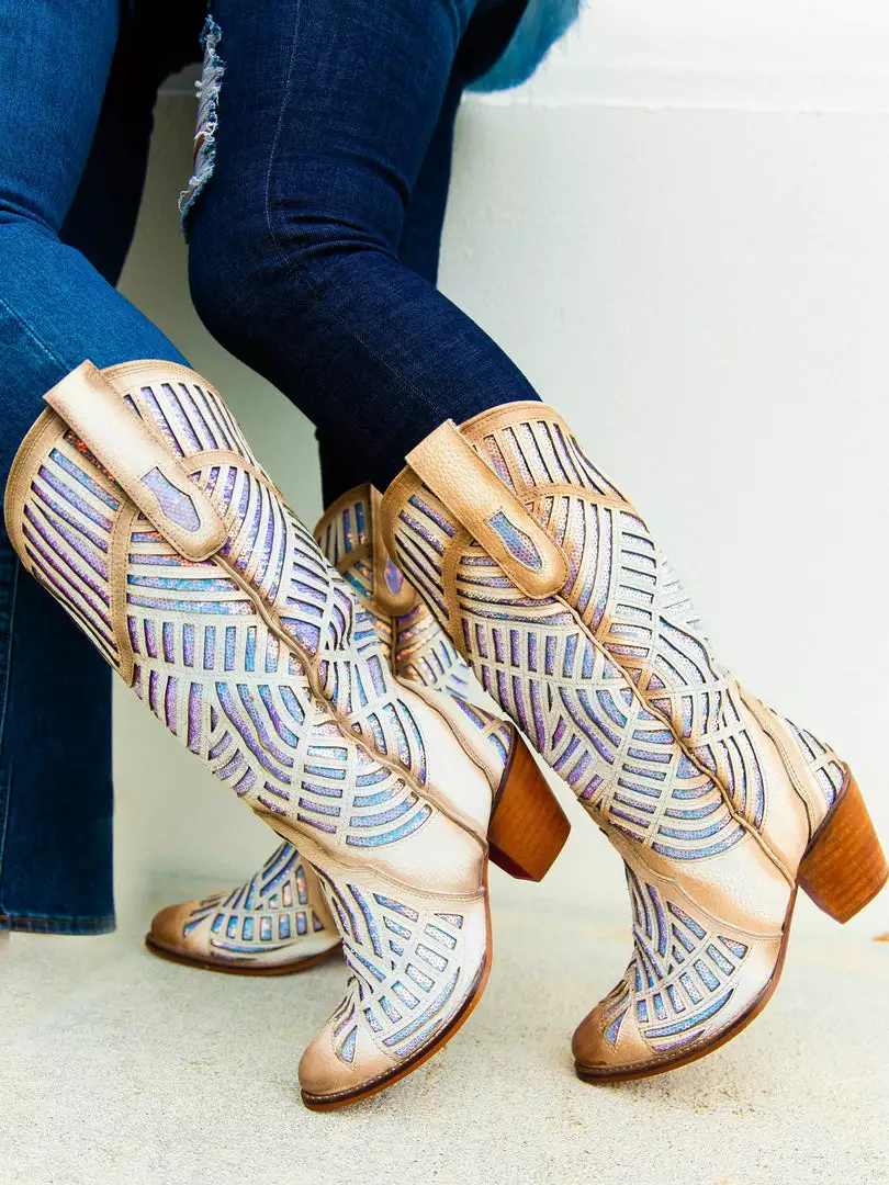 New cowgirl boots never looked so classic! Our Retro Cowgirl western boots are perfect for a curvy chic — they fit calves 18″ beautifully. These western leather boots feature a custom laser-cut design with inset iridescent pink-hued sequins. They even rock our signature pink sole; like Louboutin but country! If this boot was an animal, it’d be a unicorn with a drawl.