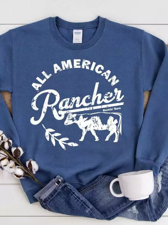 All American Rancher! We love supporting locals! This sweatshirt is designed by a small woman-owned business in Nevada! Make sure you support these local ranchers! This blue sweatshirt features a cow! It’s so simple, yet eye-catching. This will be my go-to sweatshirt for those chilly nights at the ranch and by a cozy fire! Pairs perfectly with your jeans or leggings!