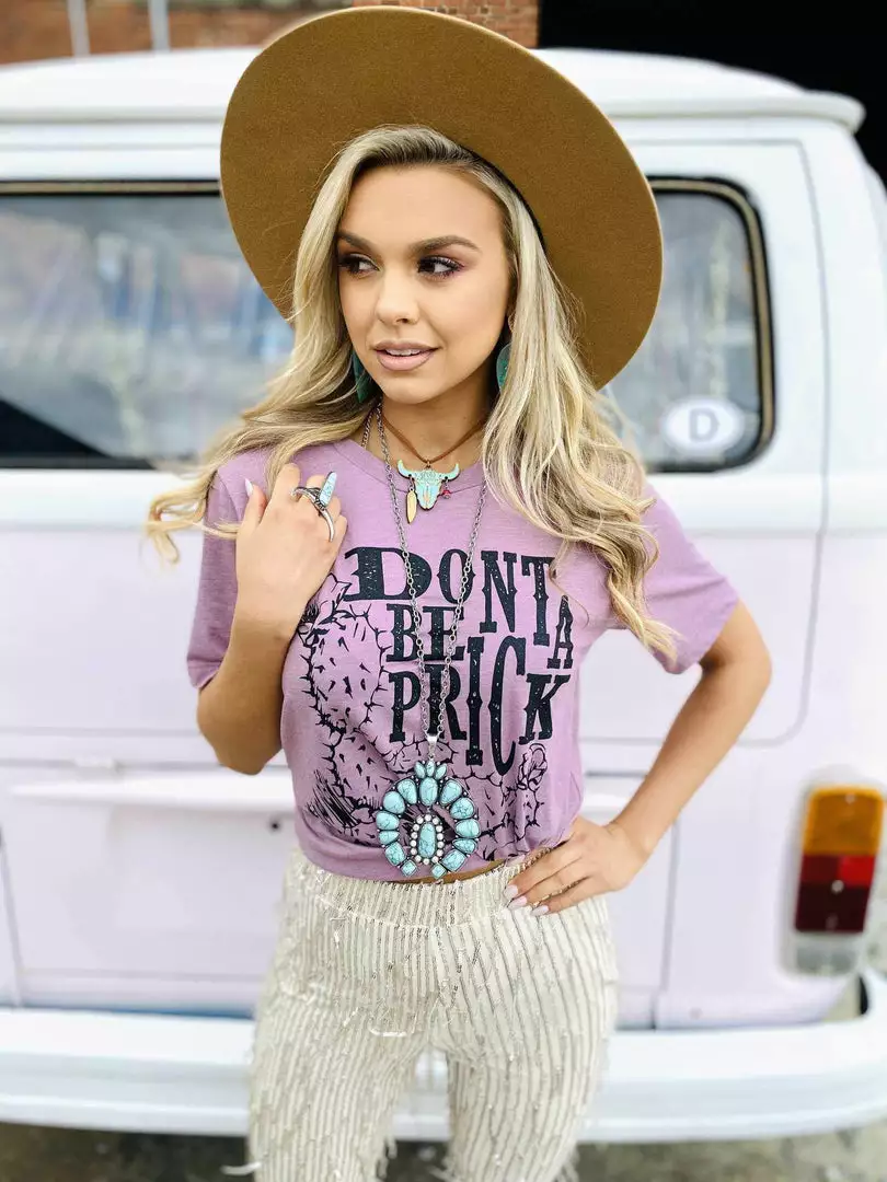Don’t Be A Prick. Wise words to live by! We are loving this Buckin’ Barn T-Shirt! Pair this with your favorite cutoff denim shorts and Western Boots!