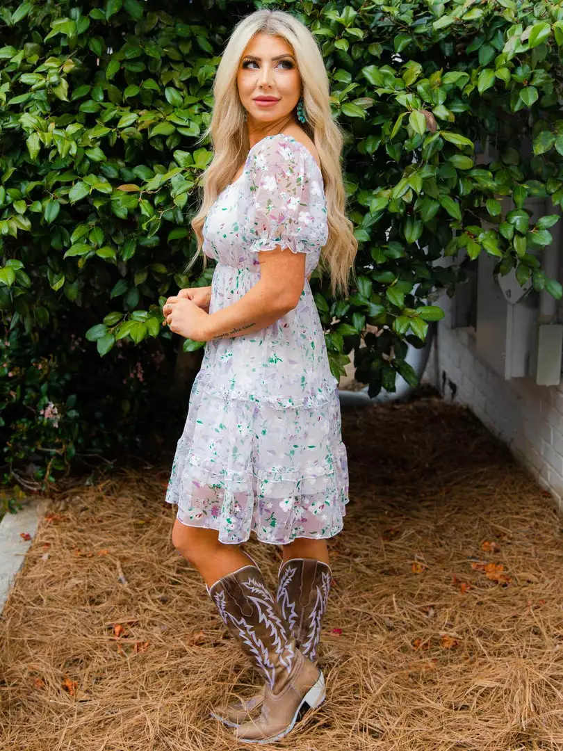 This sweet floral dress is perfect for every occasion! Delicate floral pattern throughout with a square neck, empire waist, and sheer puffed sleeves finished off with a flirty ruffle along with the skirt – this dress is an ultra-feminine and sweet addition to your closet!