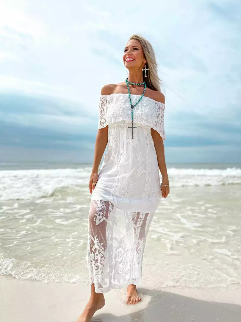 Romantic and boho-chic, the Bridal Ivory Off Shoulder dress is the perfect style for the carefree bride. Featuring a lace overlay and illusion skirt with floral details throughout for an effortless yet beautiful look on your wedding day.Â