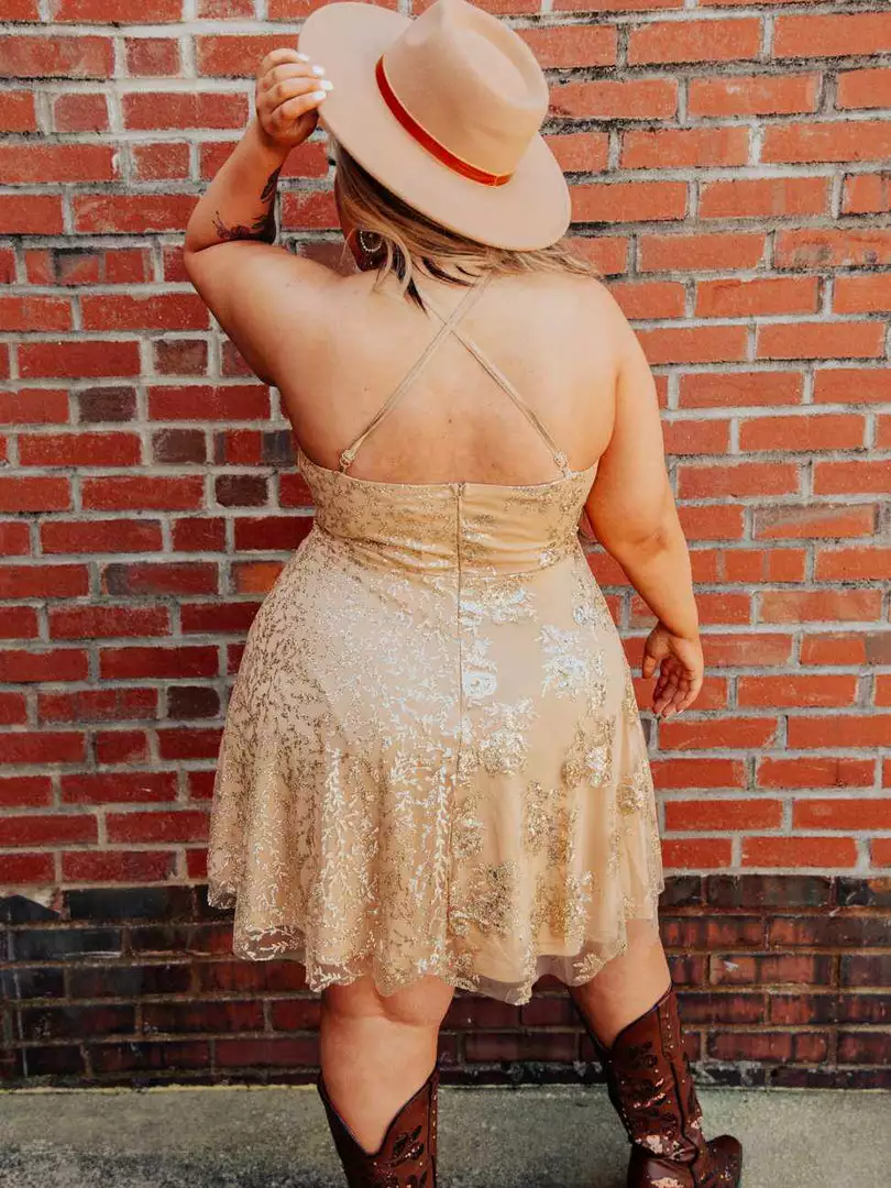 If you are going somewhere, you might as well be the best dressed The gold and neutral cross-back spaghetti strap Class and Sass dress features beautiful ornate sequin patterns throughout and a zipper back for a fun and glamourous look.Â