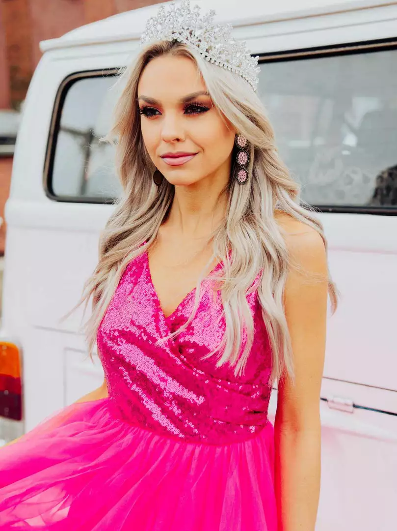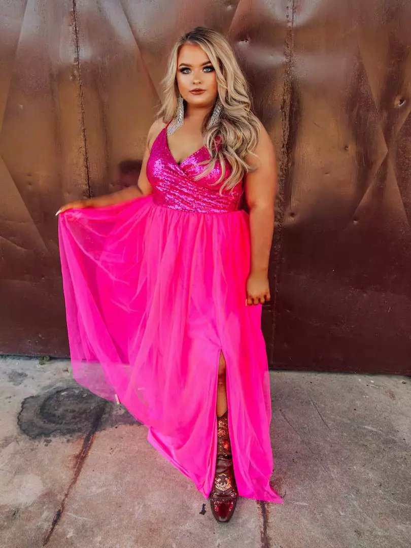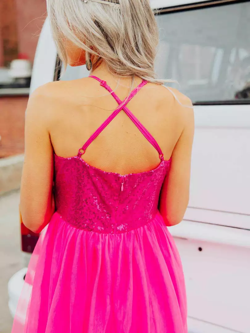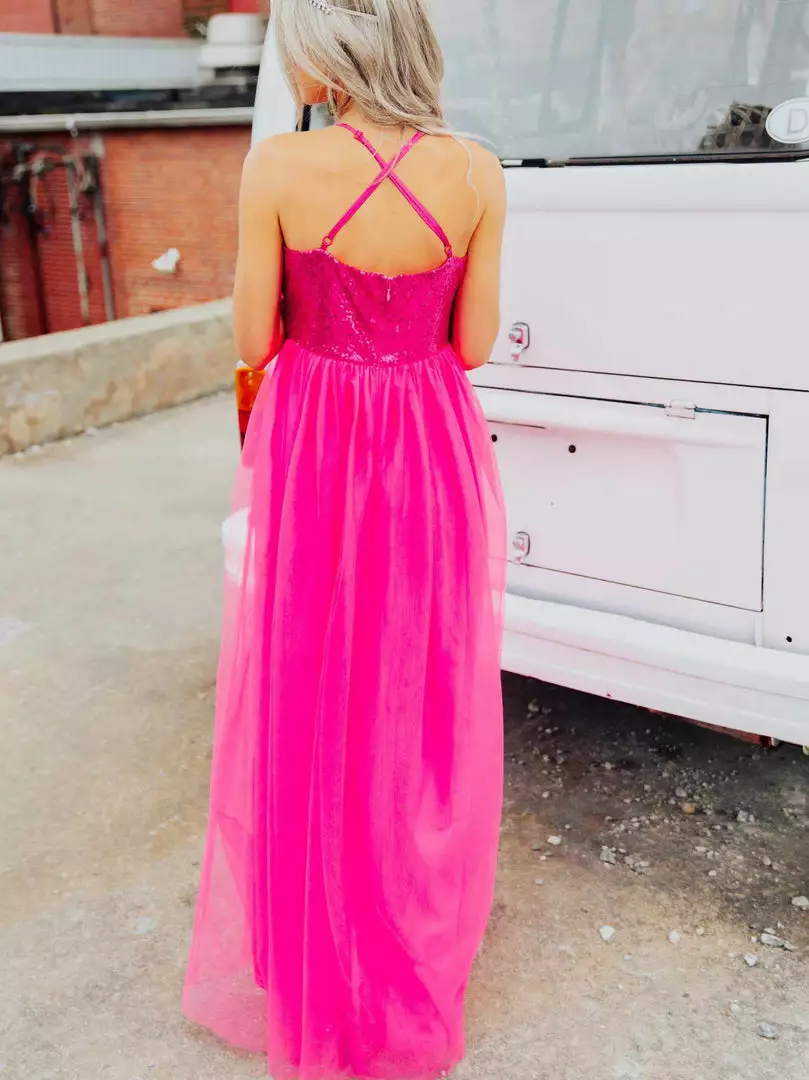Own the moment in the Playing Dress Up full length sequin and tulle dress featuring adjustable spaghetti straps and zipper back. It’s the perfect look for your next formal event.Â