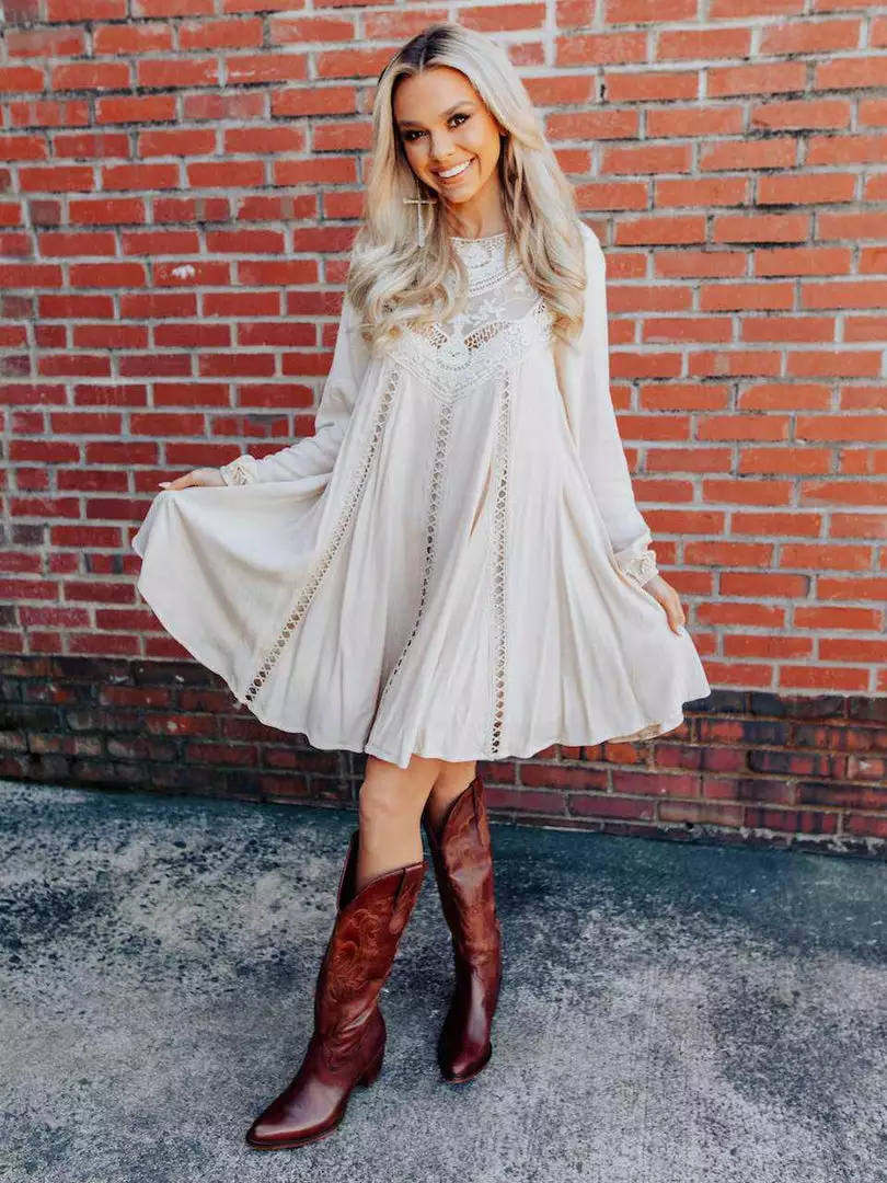 Easy to wear and perfect for a casual event. This long sleeve dress is light and comfortable, allowing you to wear it all day without feeling weighed down. Featuring a beautiful lace pattern across the top for that little something extra.Â