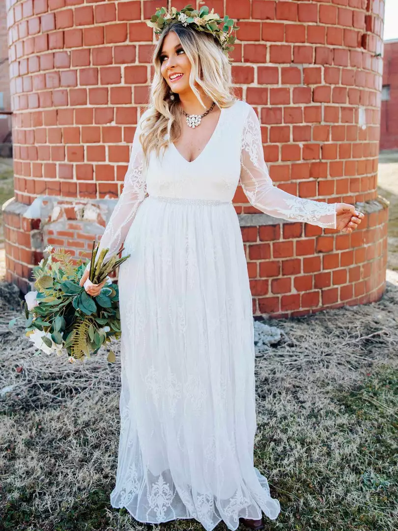 Ready to leave them all speechless? You absolutely will in this sheer long sleeve full-length dress from SFC. With its beautiful tulle overlay and vintage style applique throughout, pair it with a rhinestone belt for an even more glamorous look.Â