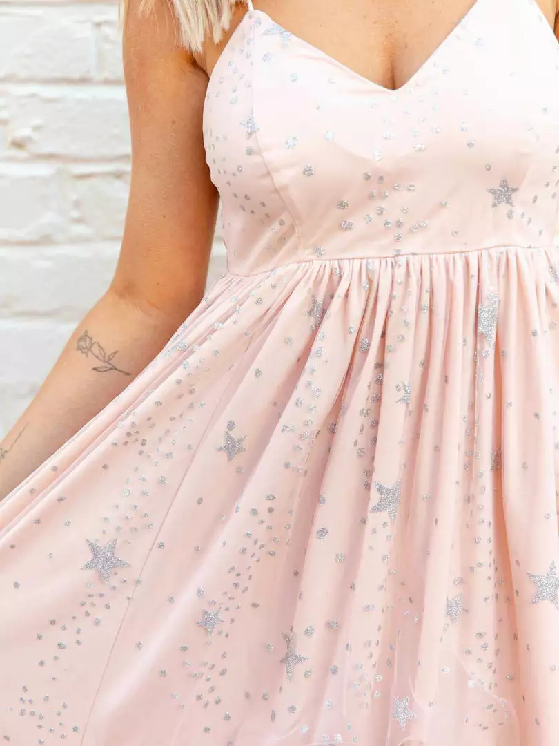 Shine bright in our “Reona Star” Dress! This dress is gorgeous and sure to make you sparkle for any occasion. Wear for date night, formal events or even photoshoots! True to size. Models are wearing a size XS & XL. Fitted through bust area.Â