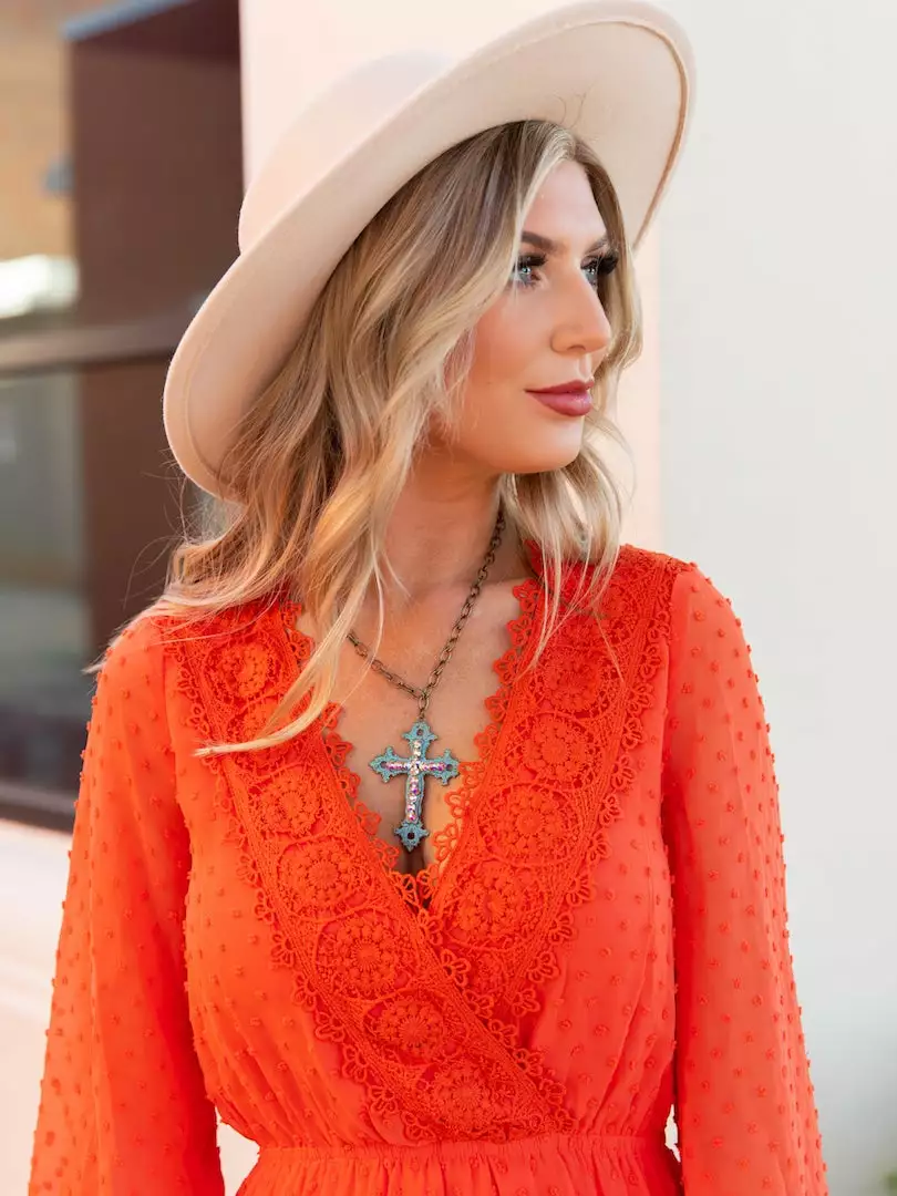 Be a darling and make every one smile when they see you in This One’s For The Ladies Dress! This vivid rust-colored dress with embroidered hem and neckline is a real STUNNER. So simple yet so impactful. Everyone will take a double look at this little piece of art on your body!Â