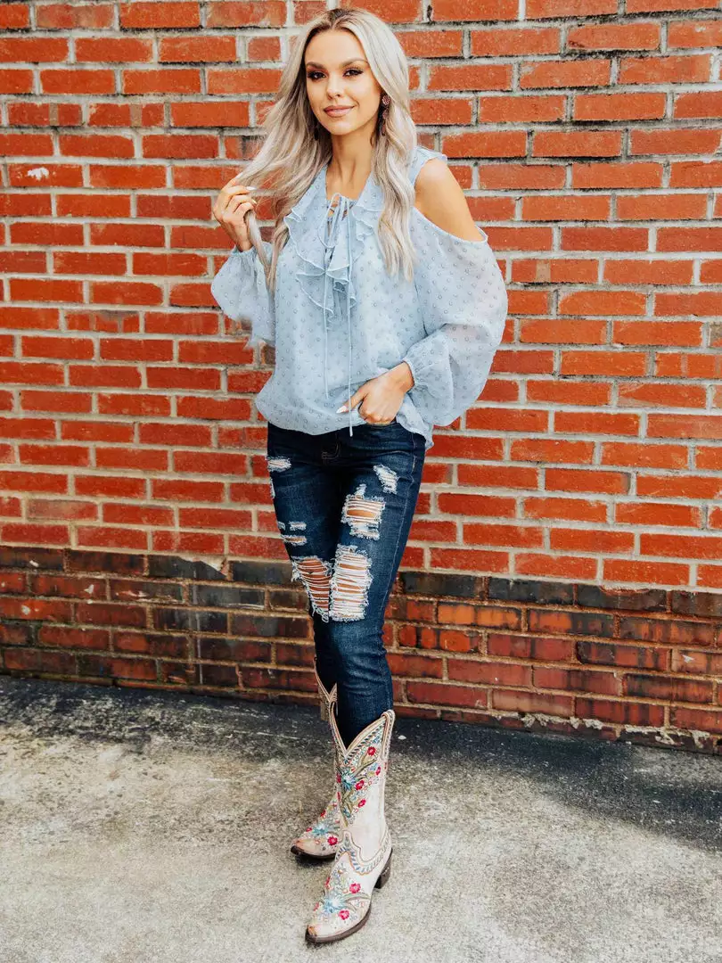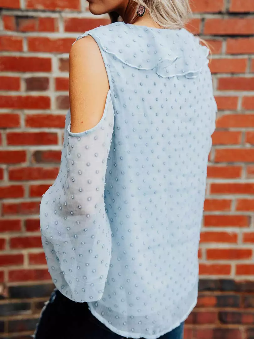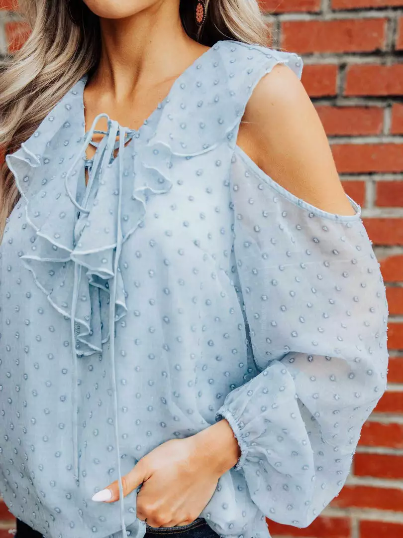 A long-sleeve cold-shoulder style ruffled top with a swiss dot pattern. Pair it with jeans and sandals or boots. Multiple colors available.