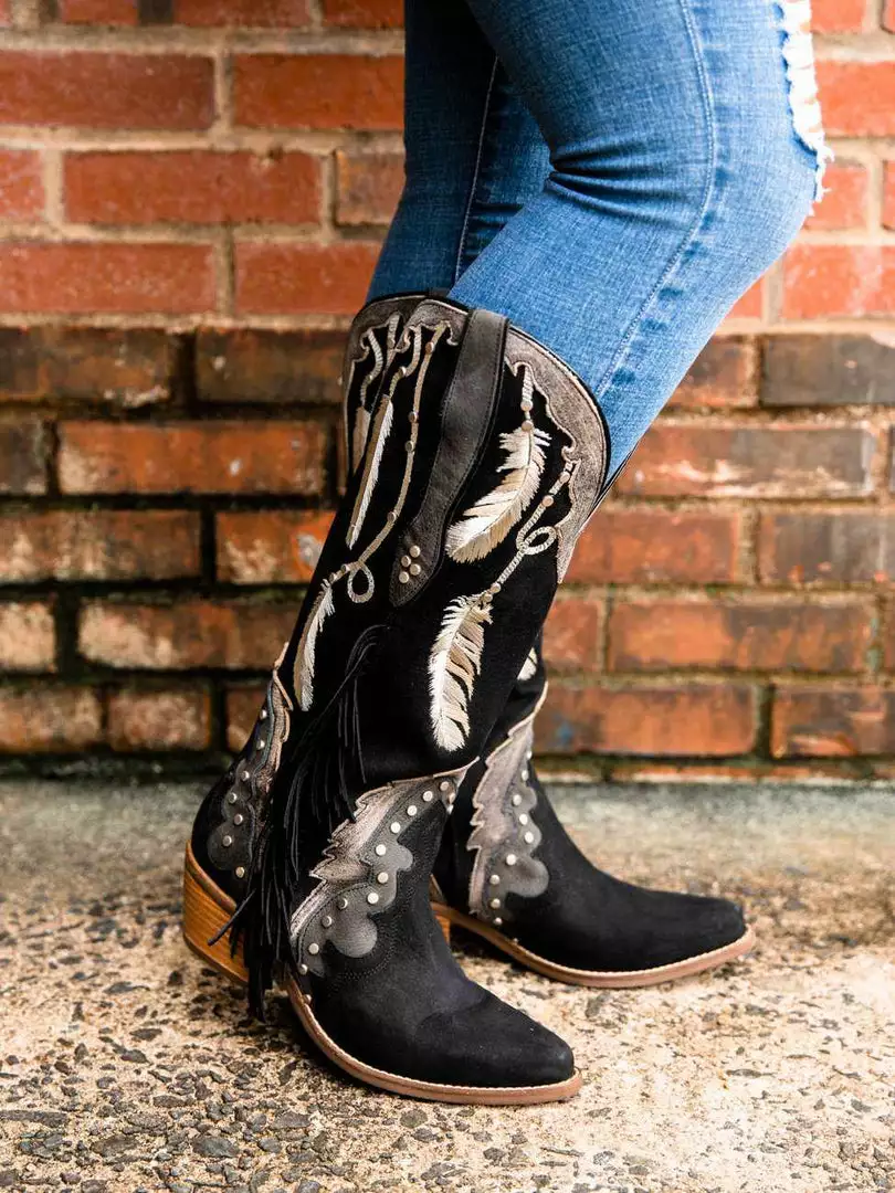 The Dream Catcherย boot is a show stopper and will stop everyone in their tracks, 12″ height. Handcrafted with soft, distressed leather and western stitching throughout. The turquoise stitching adds the final touch for these beauties. It’s dressed up with a high fashion heel, snip toe, and leather outsole. Made by Laredoย from Dan Post.ย