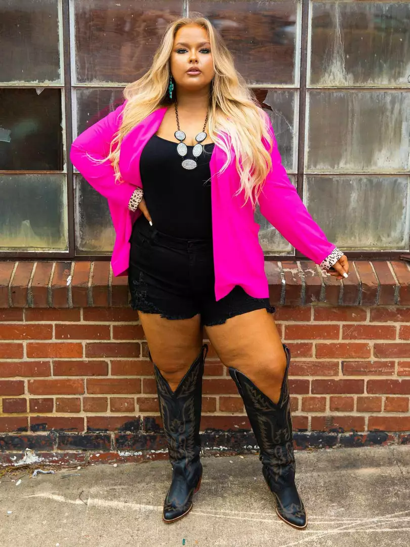 Our hot pink blazer is sure to turn heads! This blazer pairs perfectly with a bodysuit and high waisted denim this summer. Super cute for a night out on the town. Pair with boots for a concert, or dress it up with heels for a completely different look.Â