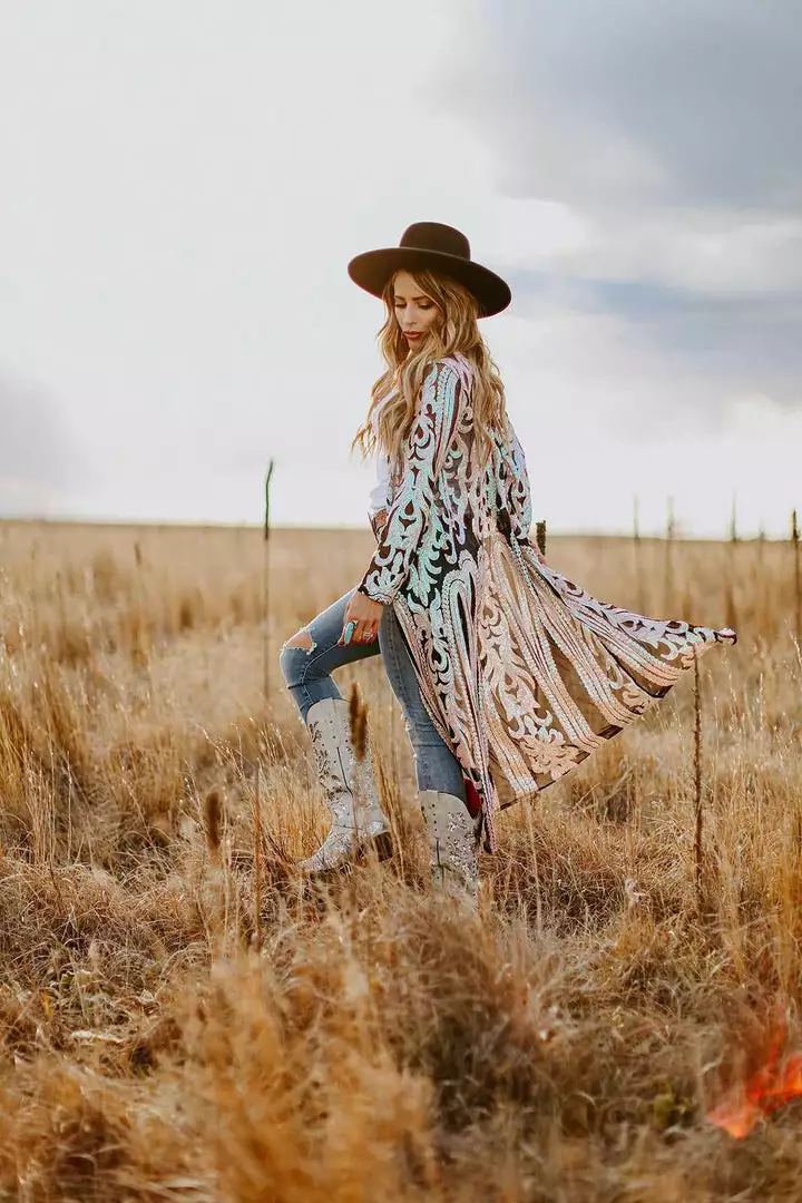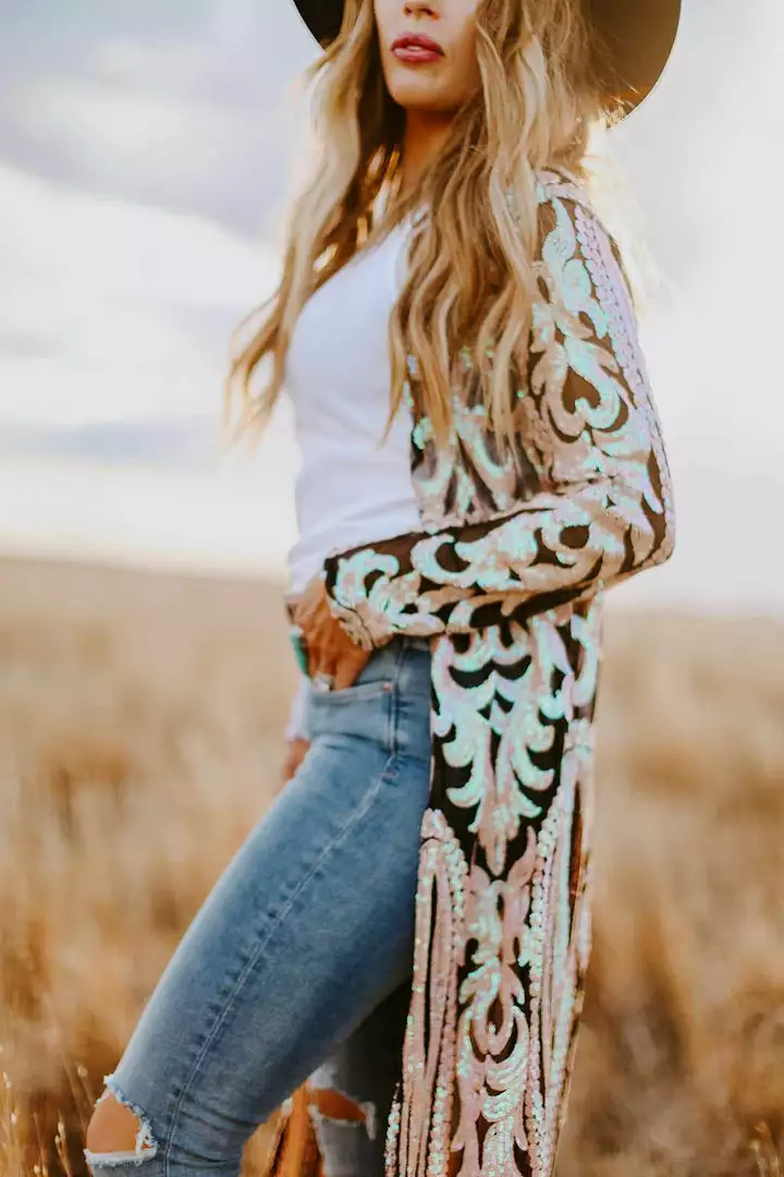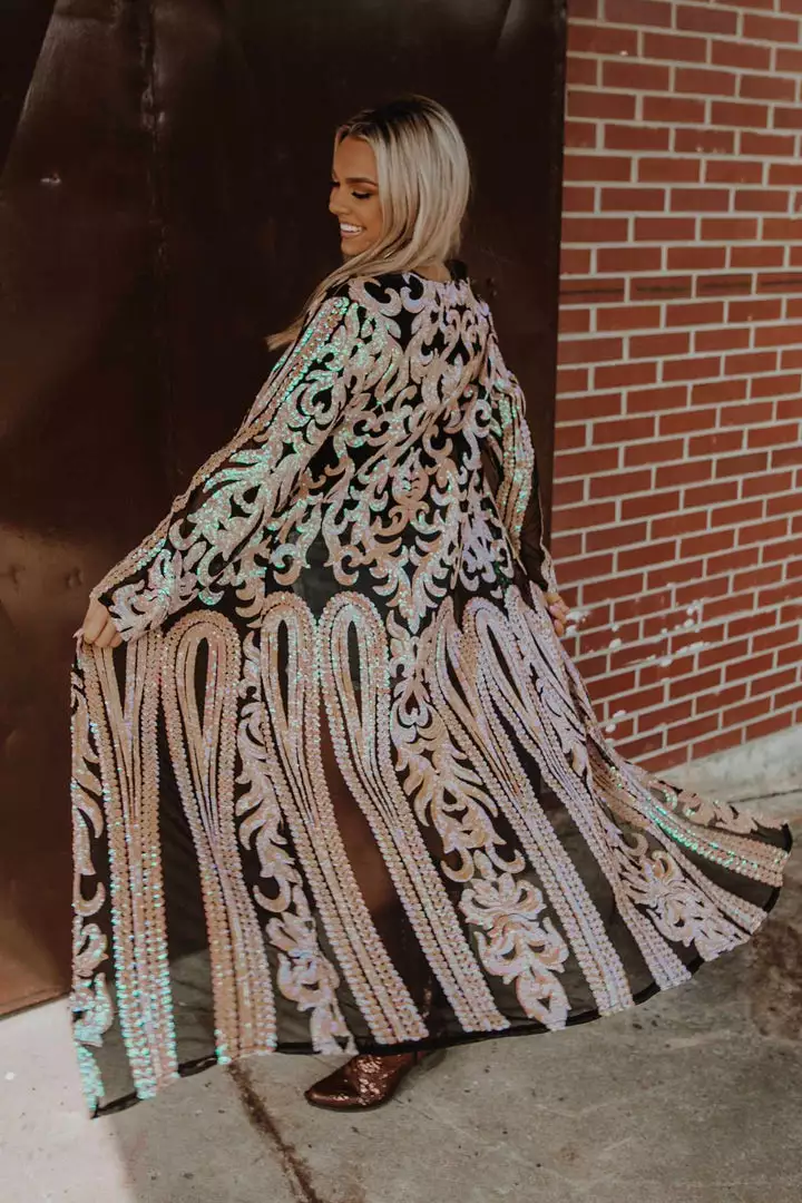 This handmade long kimono sequin duster is absolutely AMAZING! Great for special occasions, dates, or concerts. Even special for holidays like Christmas and the 4th of July. With its lightweight flattering fit, it is sure to have you sparkle and shine anywhere you go! This piece is a LIMITED EDITION! Pair a duster with your favorite tops, bottoms or dresses for a sassy look!