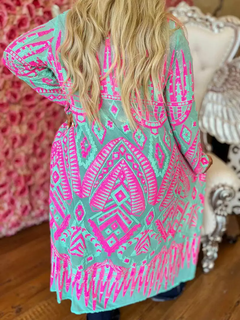Kimono Style Duster in Mint and Hot Pink