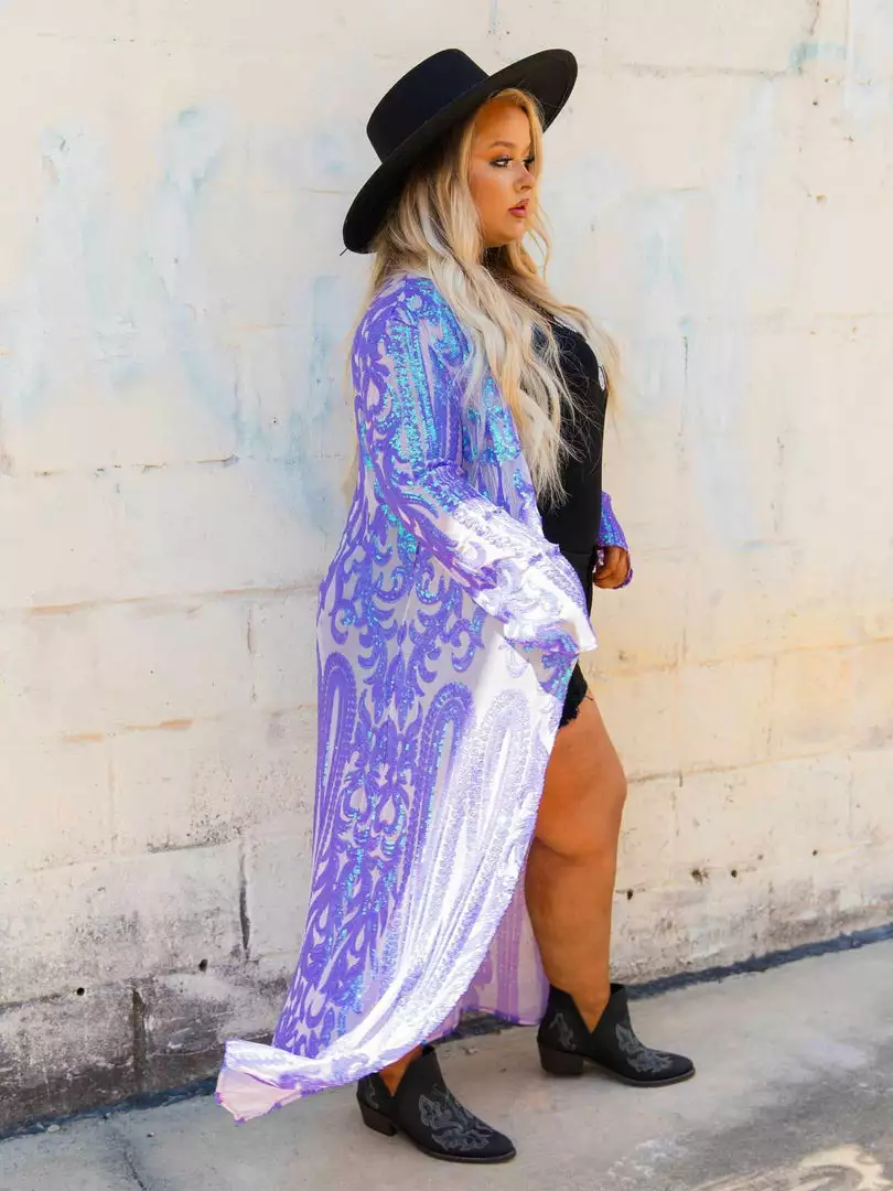 Look like royalty in our women’s duster coat with sequins! This handmade long duster jacket is absolutely AMAZING! In iridescent lilac, it’s great for special occasions, dates, or concerts. With its complementary fit, it is sure to have you sparkle and shine anywhere you go! This piece is a LIMITED EDITION! Pair a duster with your favorite tops, bottoms or dresses for a sassy and classy look!