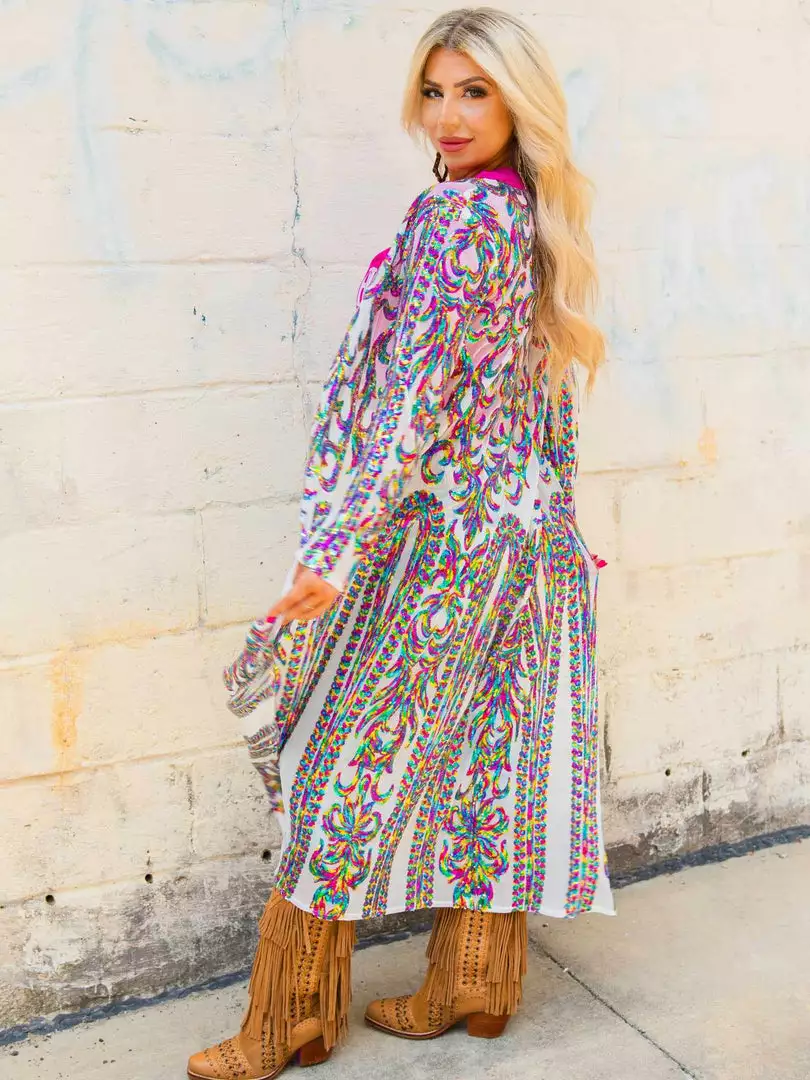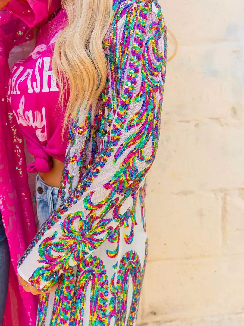 This handmade long sequin duster is absolutely AMAZING! Great for special occasions, dates, or concerts. With its complementary fit, it is sure to have you sparkle and shine anywhere you go! This piece is a LIMITED EDITION! Pair a duster with your favorite tops, bottoms or dresses for a sassy look!