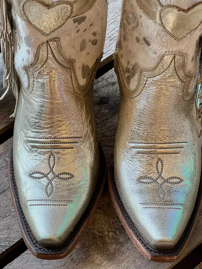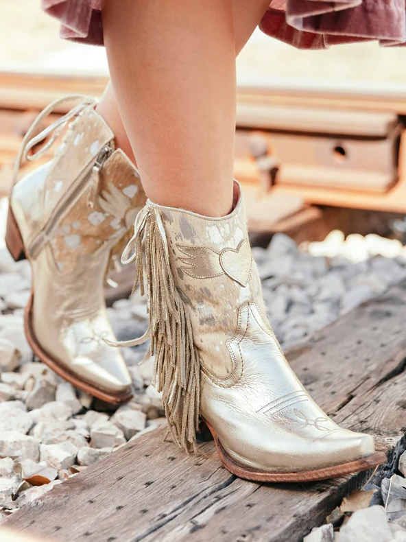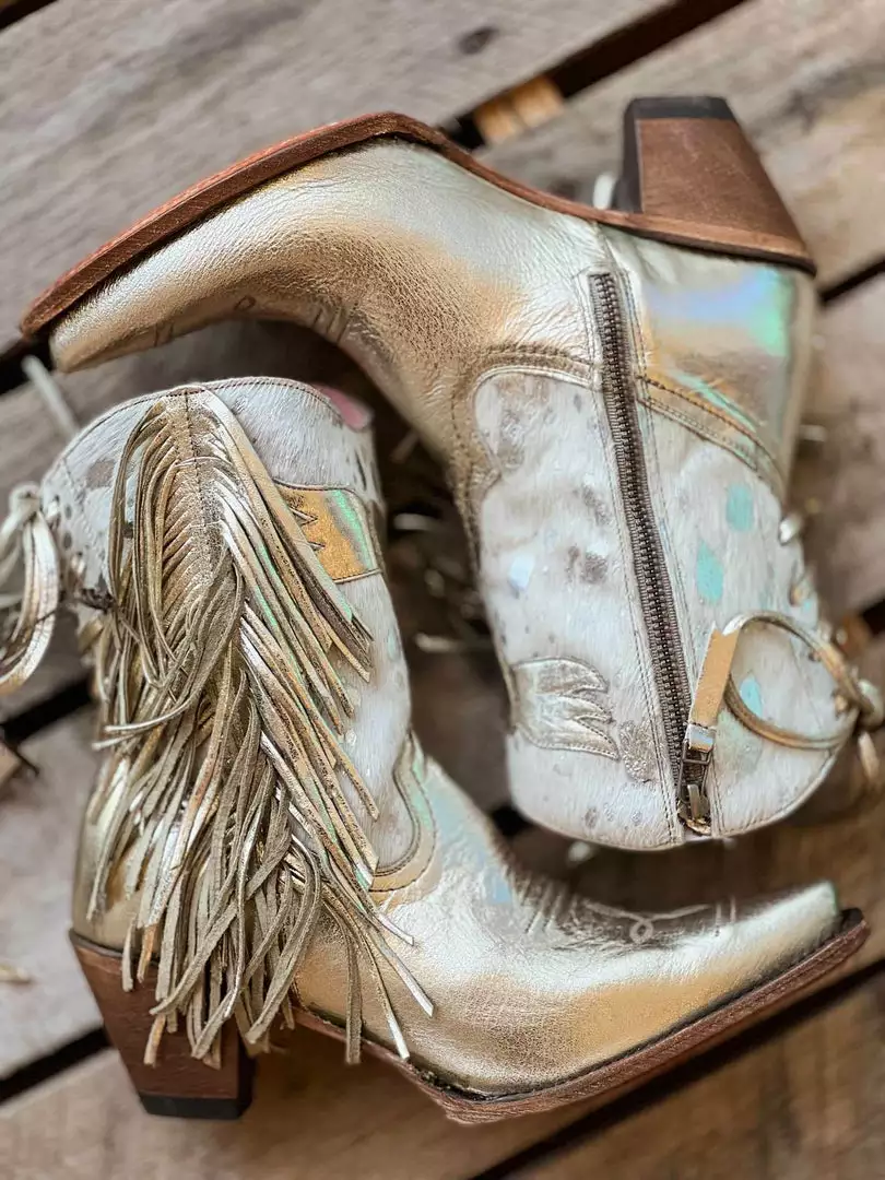 Shortie boots featuring an exclusive acid washed, hair on leather with metallicย fringe, contrast inner lining, a side zipper, medium heel, and a stylish snip toe.