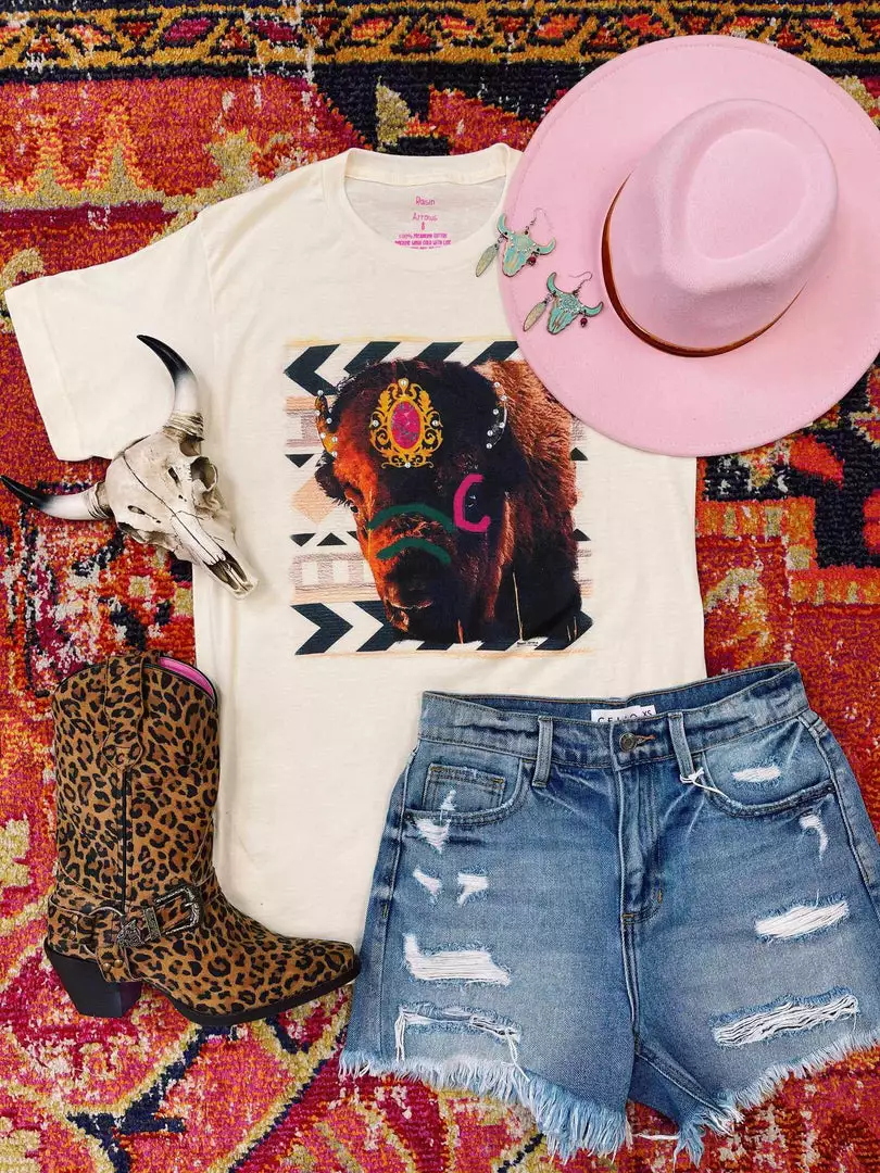 How darling is the Painted Buffalo Tee! You can never have too many graphic tees! Perfect for a casual look or dressing it up for the rodeo! Printed on a soft style unisex tee!Â