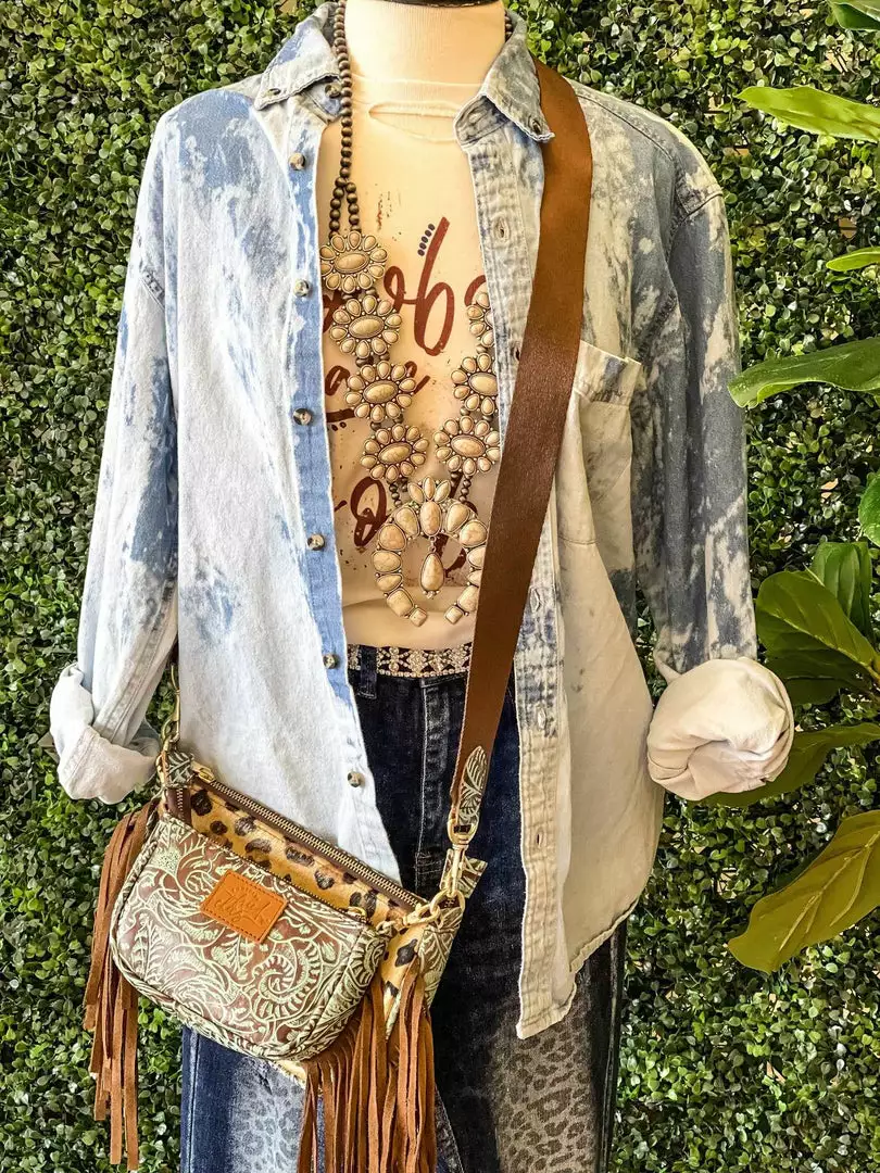 This denim button-down shirt is a must! Perfect for pairing your favorite graphic tees! This denim shirt is hand bleached with 15 hand-set crystals. This denim cut button-up shirt features an old school bus with a sunflower and skull. Custom-made just for you!Β
