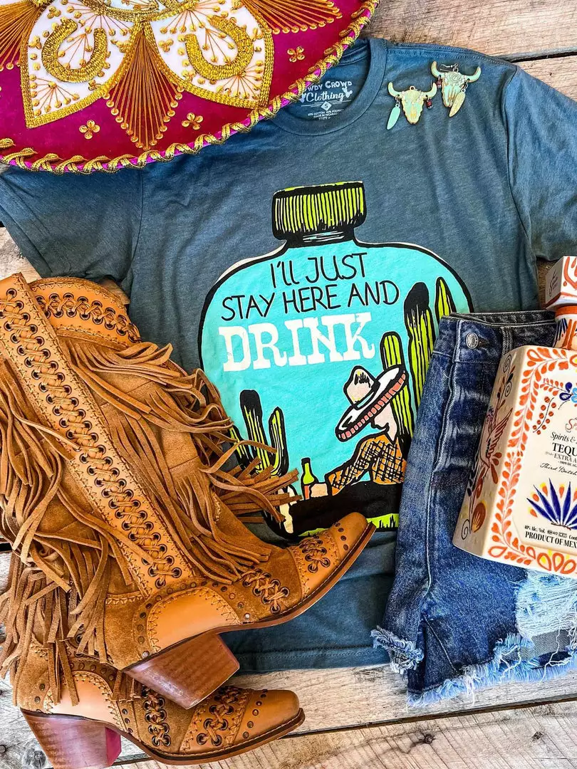 I’ll Stay Here And Drink! The party never stops in this t shirt! The colors are so vibrant! Perfect for layering! Graphic tees are our go-to!