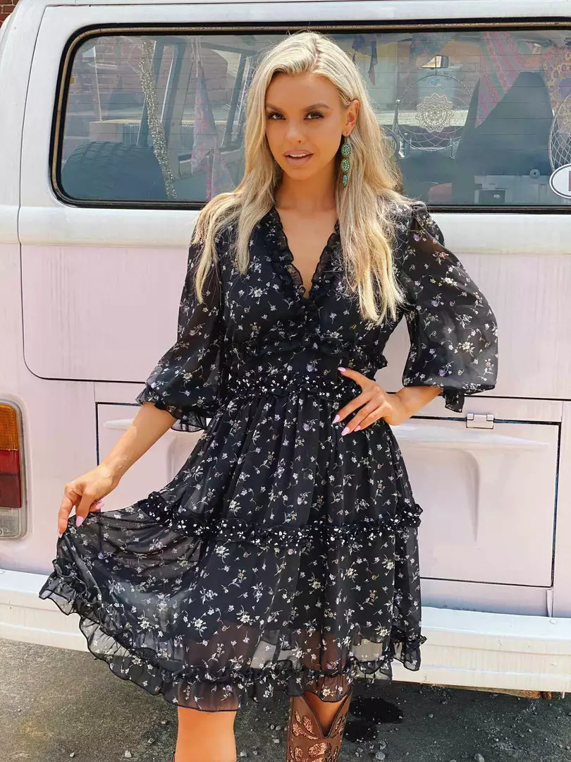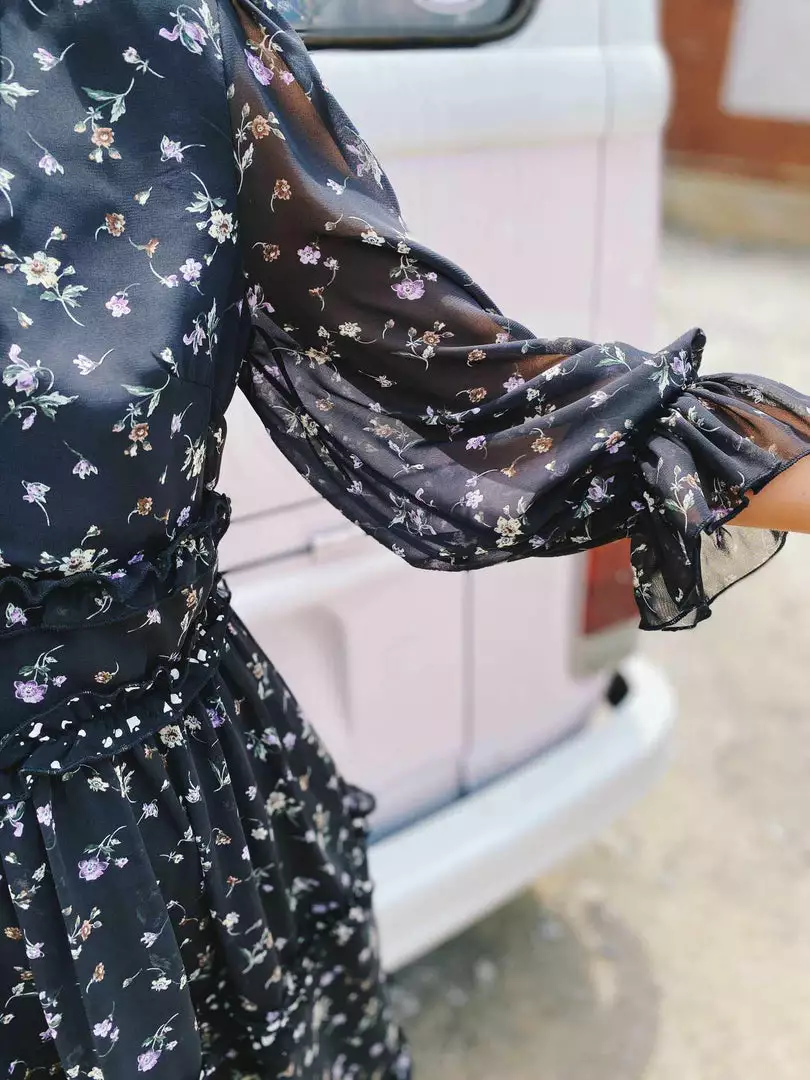 A perfect dress to transition into Fall with! Make a statement in the “Popping Lavender” Dress! This black dress has a ruffle v-neck and hemline. It features pops of little lavender flowers. It is such a flattering fit for so many people! The arms are not lined, but give off a beautiful sheer look! The dress is lined throughout the body and has a zip closure on the back. Designed by our owner, Liz, and part of the Chics Collection.