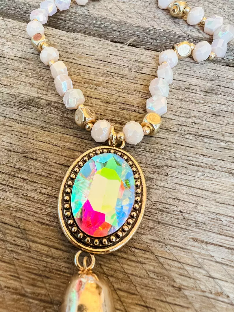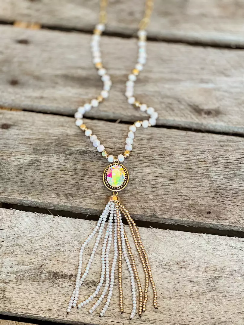 Delicate, sparkling and trendy beaded tassel necklace with a beautiful iridescent oval crystal pendant! This lovely gold necklace adds a feminine and sophisticated flair to any outfit.