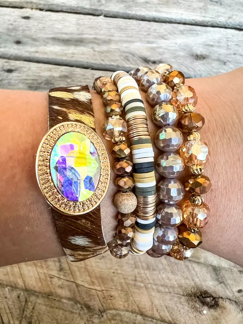 This brown, gold, and neutral stackable bracelet set features 4 multi beaded bracelets and 1 faux fur cuff with crystal emblem!