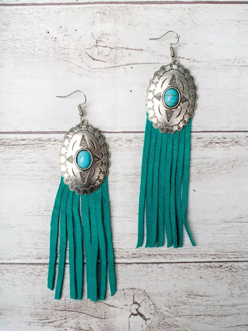 These turquoise concho earrings have serious boho western vibes! The silver concho has a turquoise stone in the center followed by flowing textured turquoise fringe!