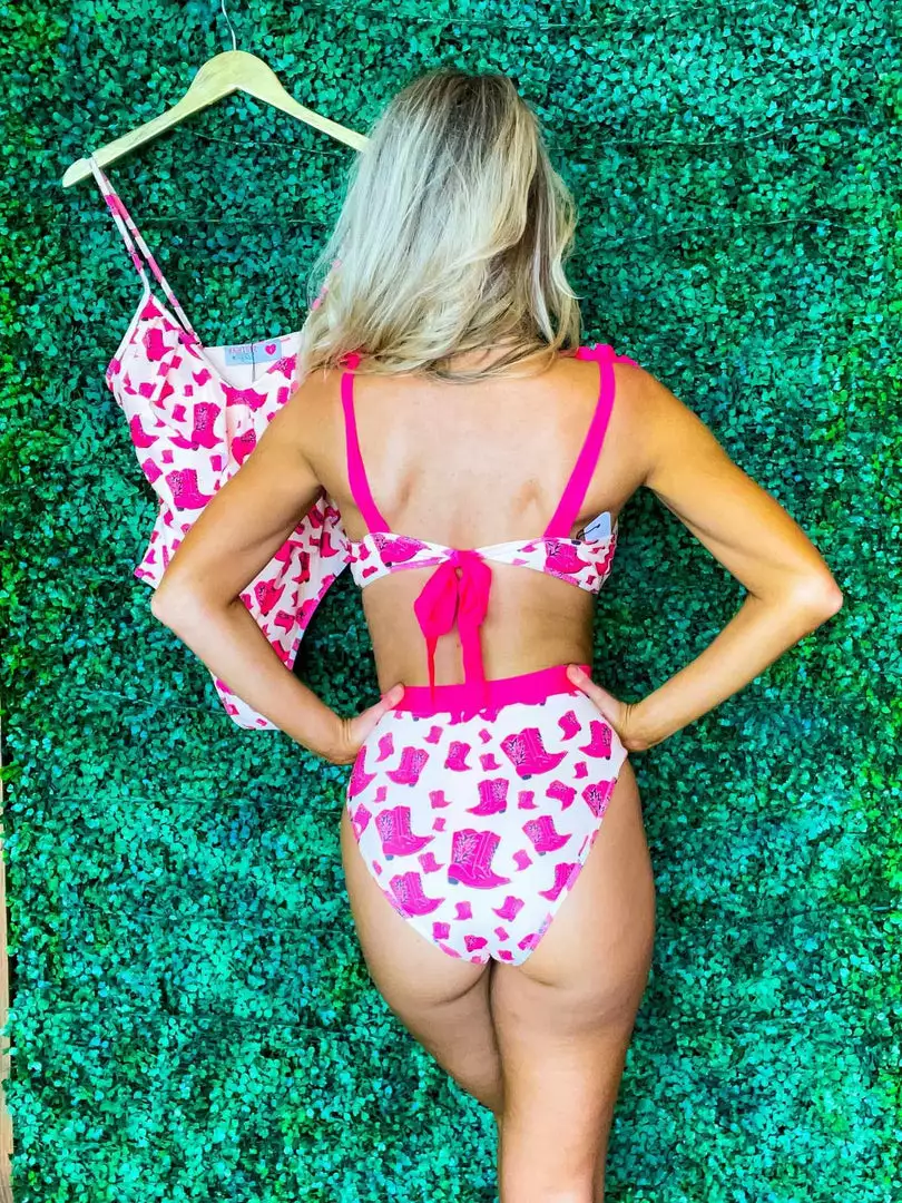 High Waisted Bikini Bottom in Pink and Cowgirl BootsÂ