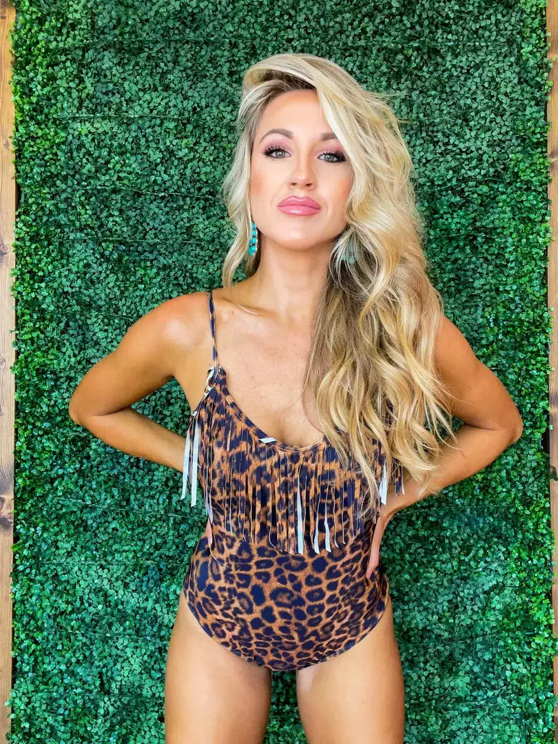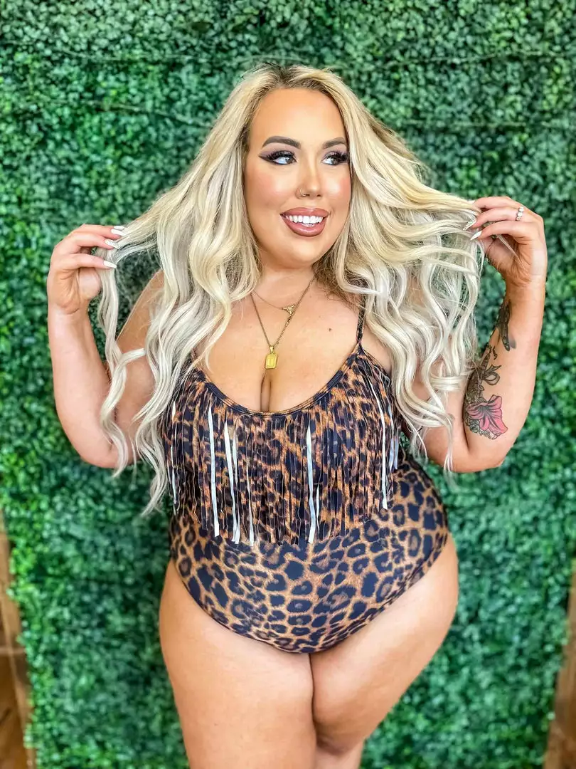 This hot little number is not your grandmothers one-piece! Our sassy leopard print one-piece swimsuit features a fringe trim along the neckline which not only gives you extra coverage but is super flattering for a small bust! A great swimsuit for curvy chics!