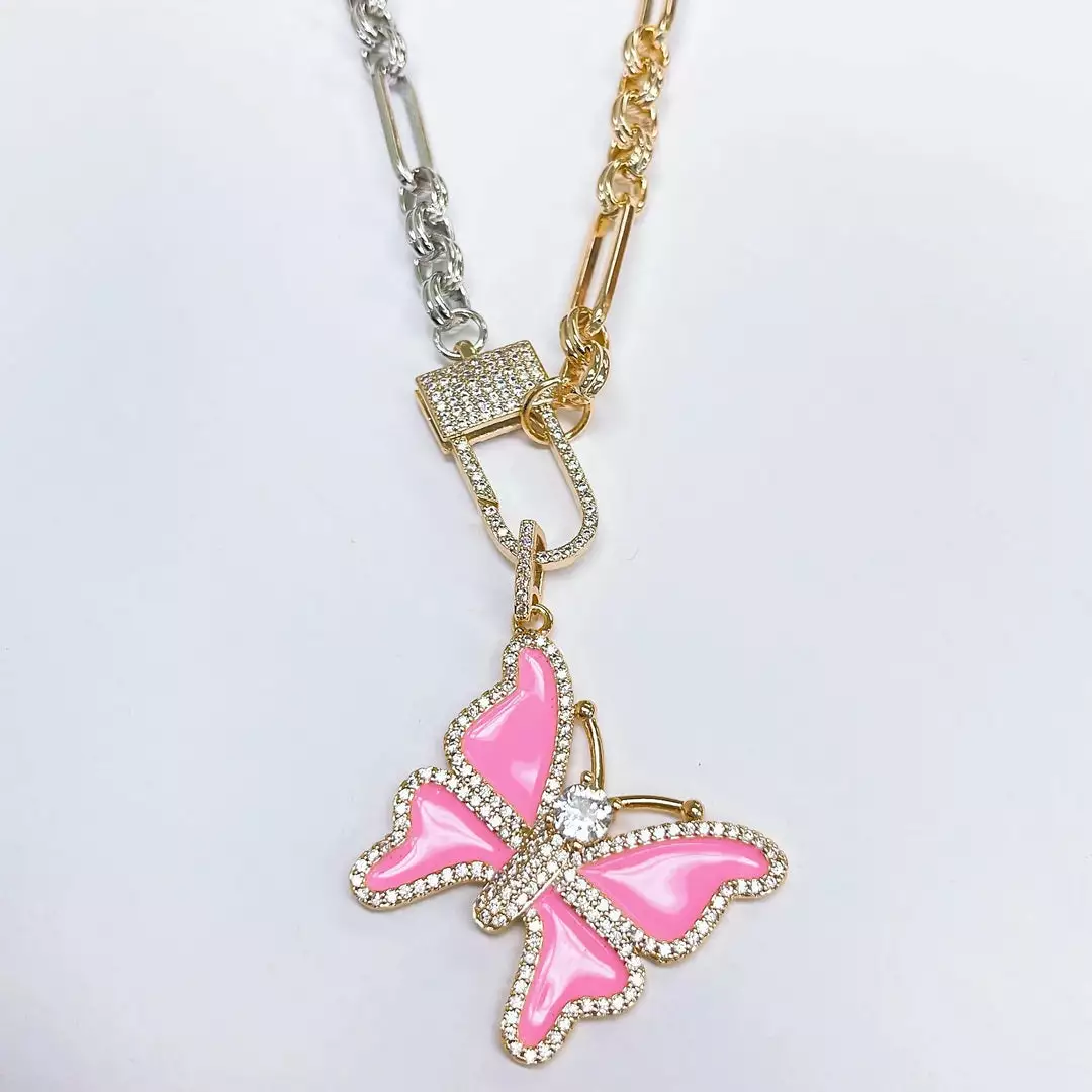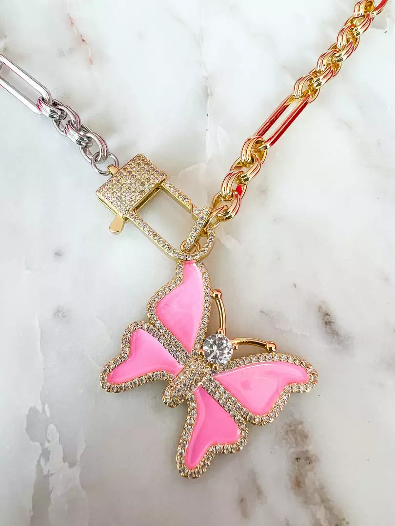 Absolutely precious pink butterfly pendant with a chunky two-toned gold and silver chain. The pink butterfly features accent crystals that add just the right amount of sparkle.