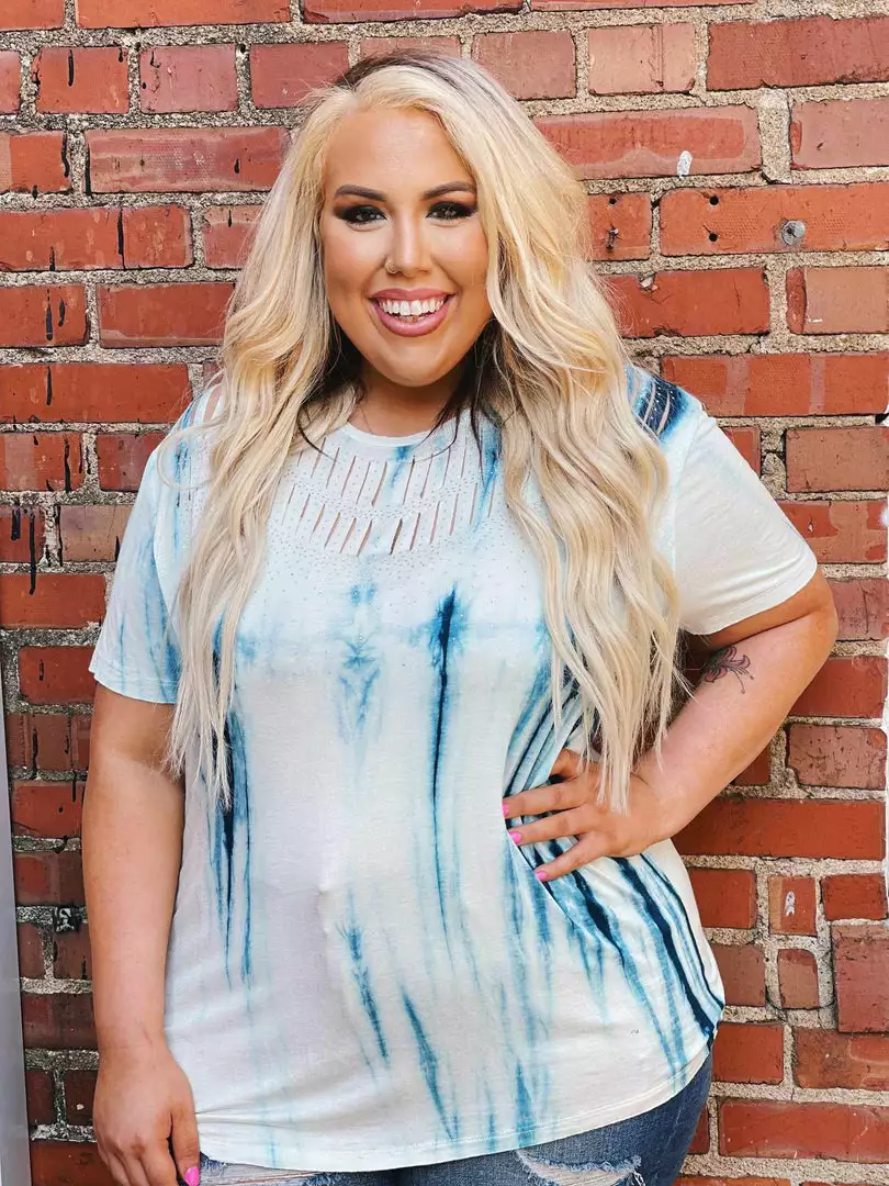 Be the first to review “Vocal Tops Tie Die Laser Cut Short Sleeve Top With Bling – Blue & White” Cancel reply